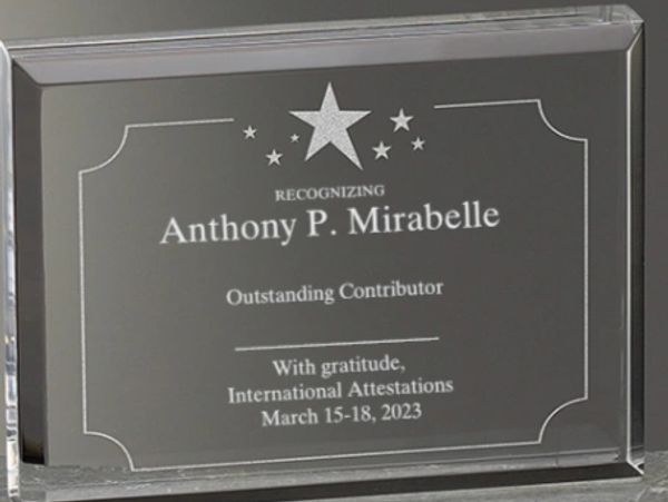 Also, a supporter was Anthony Mirabelle, her would-be fiancé. While they did not work out romantically, his support was invaluable to the formative years of International Attestations. As such, she gave him a plaque to thank him for his contribution.